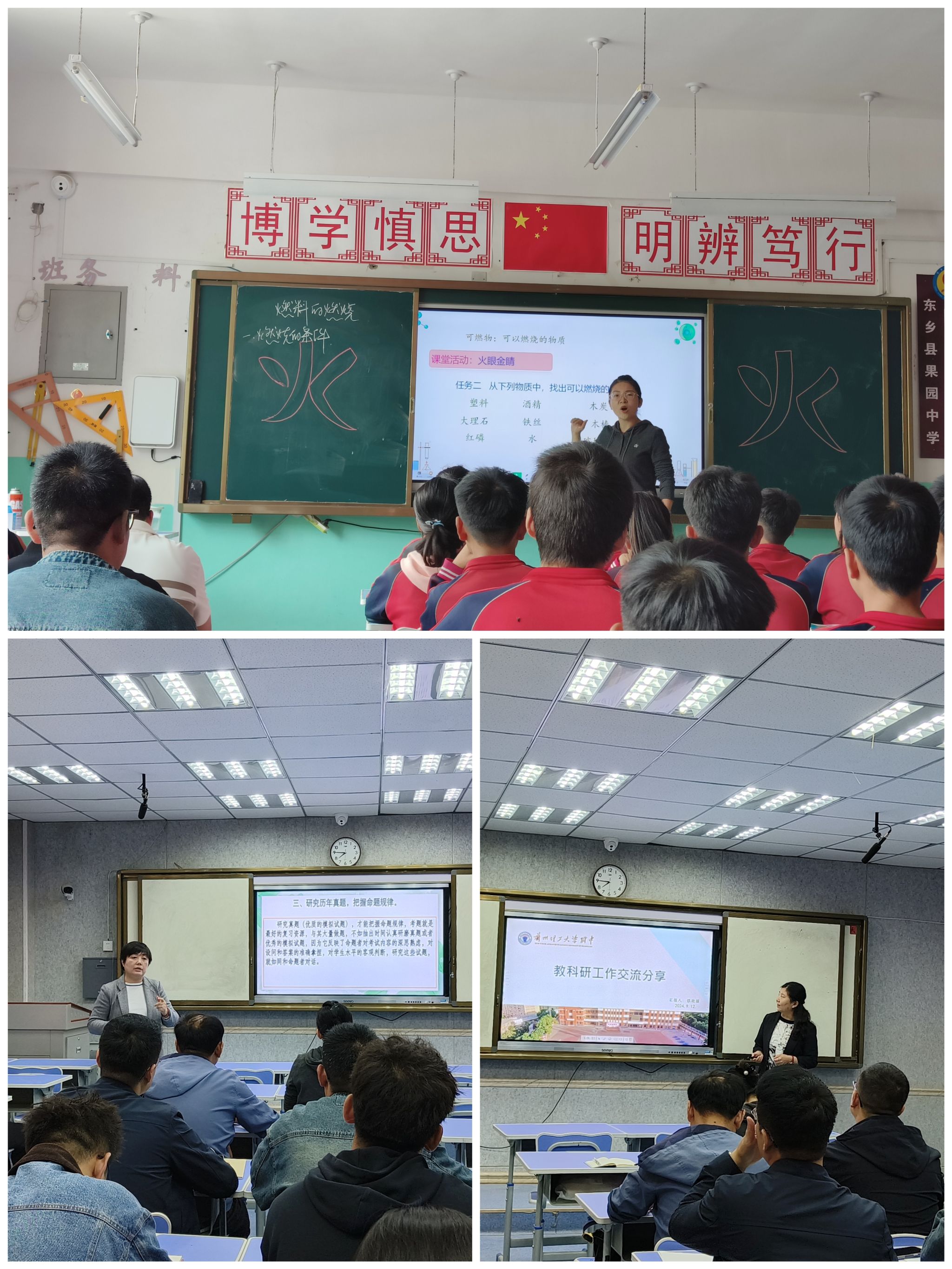 当天上午,果园中学校长杨俊伟围绕支部共建、师资培养、教师支教、学生研学等方面与附属中学一行进行了深入交流。附属中学教师刘丹展示了一节示范课——《燃料的燃烧》,用新颖的教学理念、娴熟的教学技巧,有效的调动师生互动,让学生在轻松、愉悦的氛围中展开学习,充分展现出新时代教师的活力和风采,核心素养培育的综合运用效果得到了观摩教师们的一致好评。附属中学教研室主任张艳丽做了教科研工作交流分享,梳理总结了学校近年来在教科研方面的经验和成果,为促进果园中学教研工作提供了有益的借鉴。杨静与果园中学的老师们进行了新中考备考经验的分享与交流,围绕学校管理、学科建设和新教材使用等方面提出了中肯的建议。附属中学还为果园中学的孩子们赠送了文体用品。