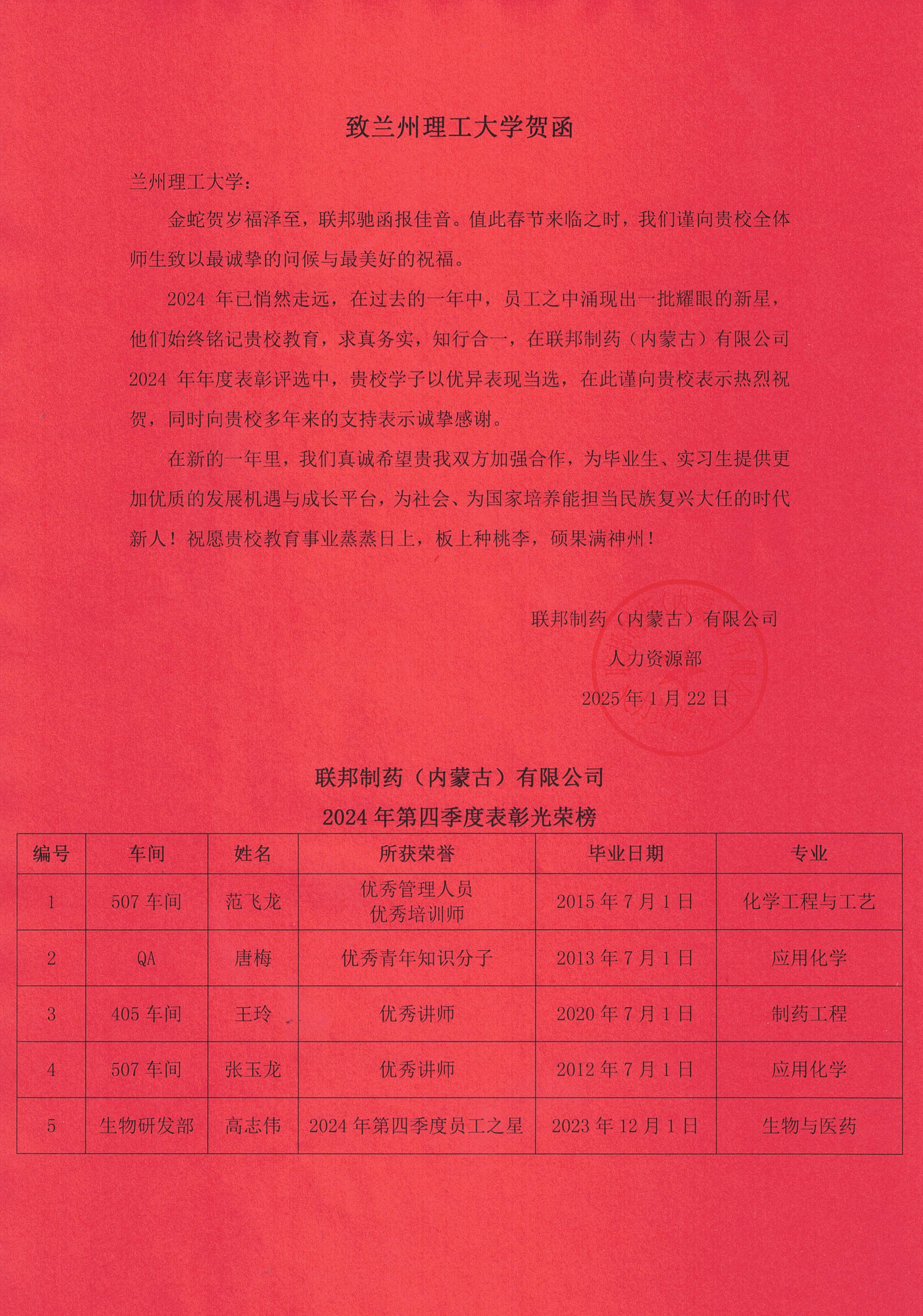 1月22日,联邦制药(内蒙古)有限公司向学校发来贺函,祝贺来自生命科学与工程学院和石油化工学院的多位毕业生以优异表现,在2024年度公司表彰评选中获得嘉奖。