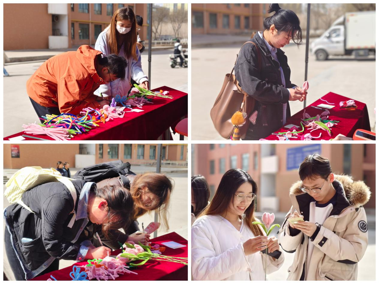 结合“三八”国际劳动妇女节,学院面向全体女性学生,在一站式学生社区举办“芳华绽放”关爱活动。活动现场设置“双视角创作”环节,男生组构思创意造型、女生组精雕花瓣细节,协作完成花艺作品,培养团队精神。志愿者们将20朵立体郁金香制成“心愿盲盒”祝福卡,点缀于教学楼、学院楼等场所,传播优秀文化。