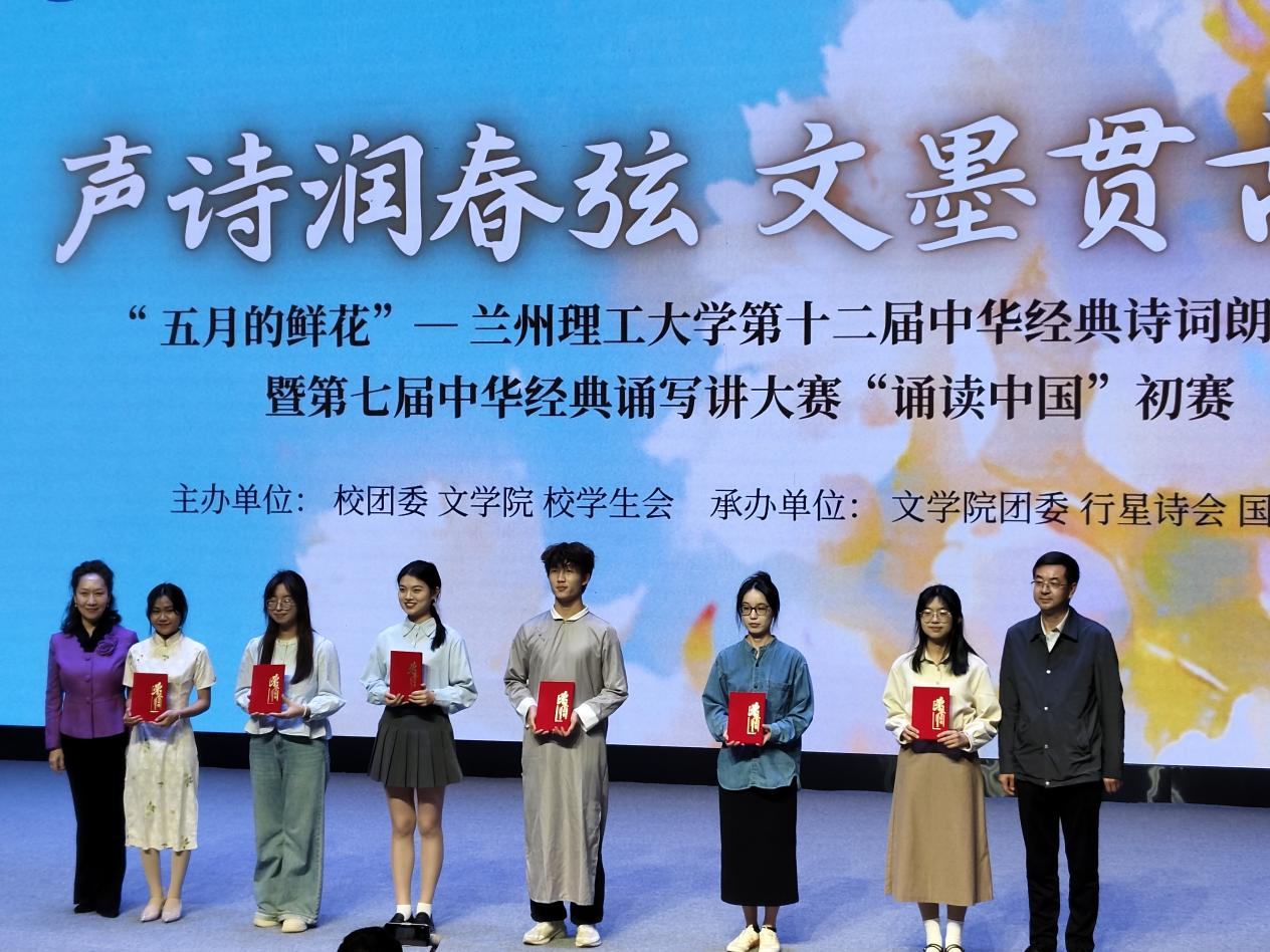 5月18日晚,由文学院、校团委、校学生会联合主办,文学院团委、行星诗会、国学会共同承办的"诗词传承文明,经典浸润人生——五月的鲜花"第十二届中华经典诗词朗诵大赛暨第七届中华经典诵写讲大赛在学校彭家坪校区银杏大讲堂举行。大赛邀请甘肃省诗词学会吟诵委员会副会长丁光明、甘肃省广播电视总台青春调频副总监董志强、兰州理工大学文学院教授杨晓霭等七位专家担任大赛评委。全校共400余位师生一起聆听经典诵读,感悟中国传统文化。