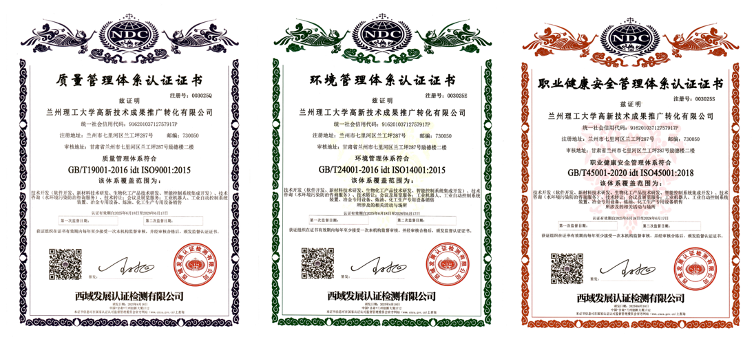 近日,兰州理工大学高新技术成果推广转化有限公司顺利取得“ISO三体系”(ISO9001质量管理体系、ISO14001环境管理体系、ISO45001职业健康安全管理体系)认证证书,这是公司在提升企业综合实力过程中取得的新进展,标志着我校高新技术成果推广转化有限公司在精细化、制度化、规范化管理方面迈上了新台阶。