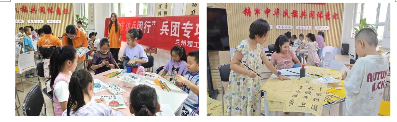 在石河子第42社区,志愿者们为兵团儿童打造了一场融合文化传承与成长启蒙的“七彩假期”实践活动。兵团精神主题绘画课堂上,孩子们用彩笔描绘出军垦战士垦荒的身影、丰收的棉田与整齐的营房,每一笔都浸透着对革命前辈的敬仰;“书法课堂”里,他们握着毛笔,在红纸上一笔一画写下“卫国戍边”“强国有我”,稚嫩的字迹中藏着对兵团精神的深刻感悟。