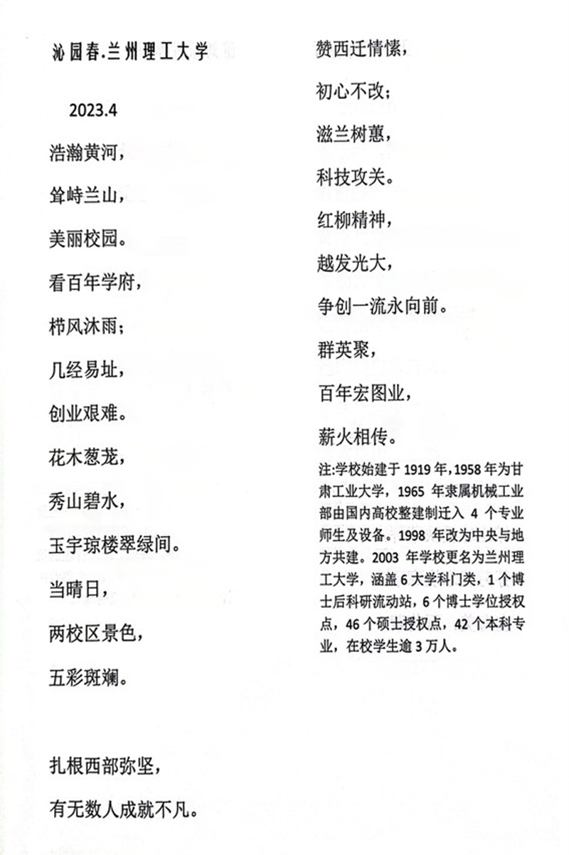 行成于专,言废于嬉。止于上贤,穷于至艺。学海无涯,铸万世之伟业赫赫,教坛有道,炳千秋之史牒煌煌。嗟夫,百年兰州理工,圆梦民族复兴而弥兴,理工百年,致力人类大同以永固。躬逢盛世,瞻仰母校,喜迎华诞,同襄盛举,微风不才,感而赋之。