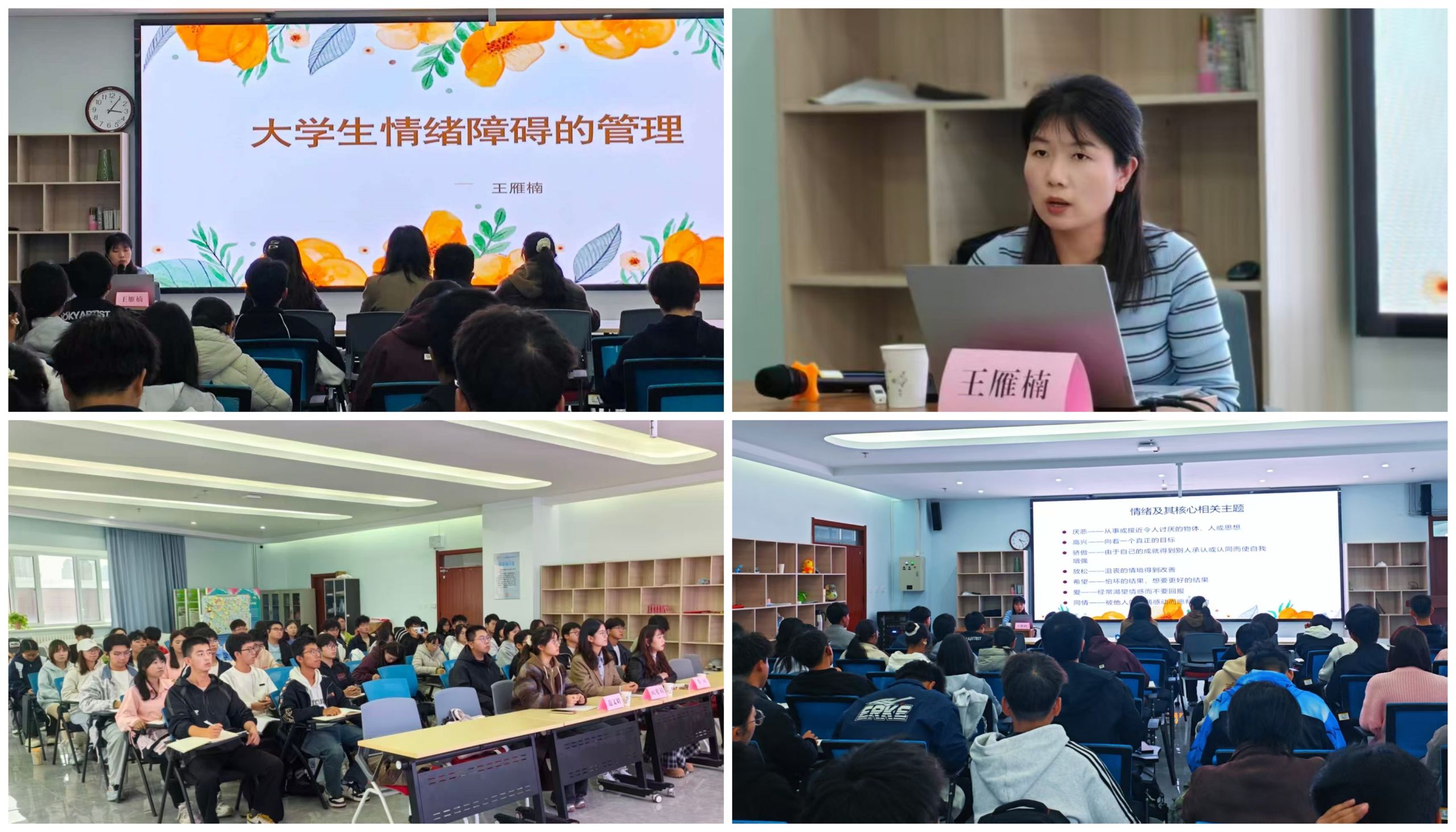 10月14日,《大学生情绪障碍的管理》主题讲座开讲,特邀兰州市第三人民医院王雁楠医生担任主讲。王医生结合丰富的临床经验,系统讲解了大学生常见的心理社会问题及影响因素,阐述了情绪对心理健康的作用机制。通过情绪的ABC理论分享了情绪管理的实用方法,并组织同学们进行了正念冥想练习。