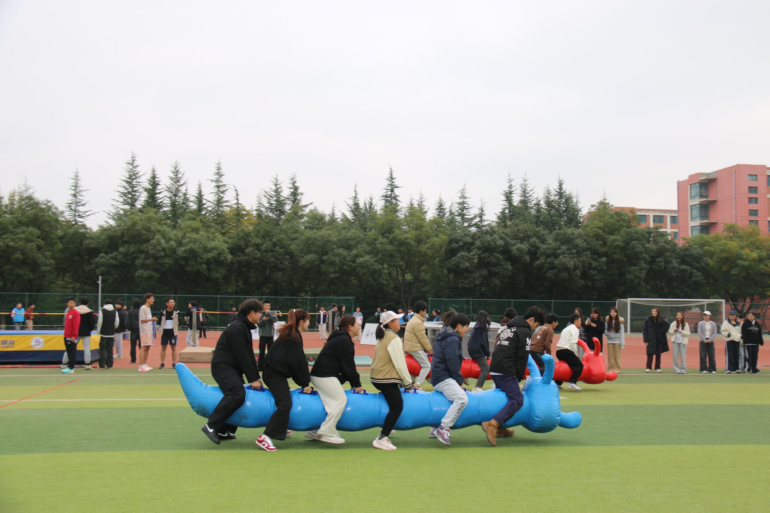 本次运动会项目设置丰富多元,兼顾竞技性与趣味性,为新生们提供了全方位展现自我的平台。其中,竞技类项目涵盖男子组、女子组及混合接力,包含短跑、长跑、跳高、跳远、铅球、垒球等经典田径项目,考验着运动员的速度、力量与技巧;趣味集体项目则设置了袋鼠跳、旱地龙舟、同舟共济等,强调团队协作与默契配合,让赛场充满欢声笑语。