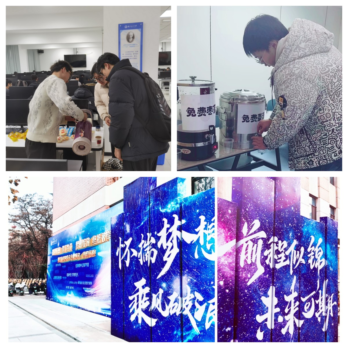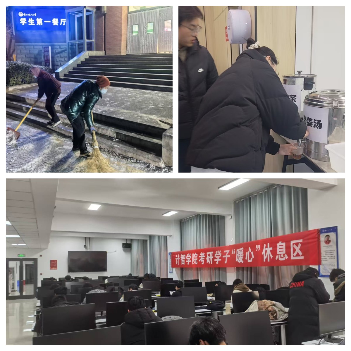 多措并举,全方位保障考研第一天,除交通、清雪、热饮供应外,学校各部门联动,为考生提供全方位保障:考前全面设置休息区,物品存放区;保卫处加强巡逻,确保考场周边秩序;三个医疗服务点校医院医生随时待命,备足应急药品;学生处、各学院学生口全天候在岗,随时准备为考生排忧解难……正如一位考生在朋友圈中所写:“今天风雪很大,但走在校园里,每一步都觉得很踏实。因为我们知道,在这条研途上,我们不是孤身奋战。”