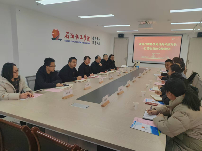 12月24日下午,白银市科技局副局长付兆祥、副局长姚虹一行到石油化工学院围绕研究生联合培养、企业导师队伍建设、校企产学研合作等方面座谈交流。石化学院党委书记李大鹏、院长李世友、党委副书记焦娜、副院长王坤杰及各系负责人参加。会议由李世友主持。