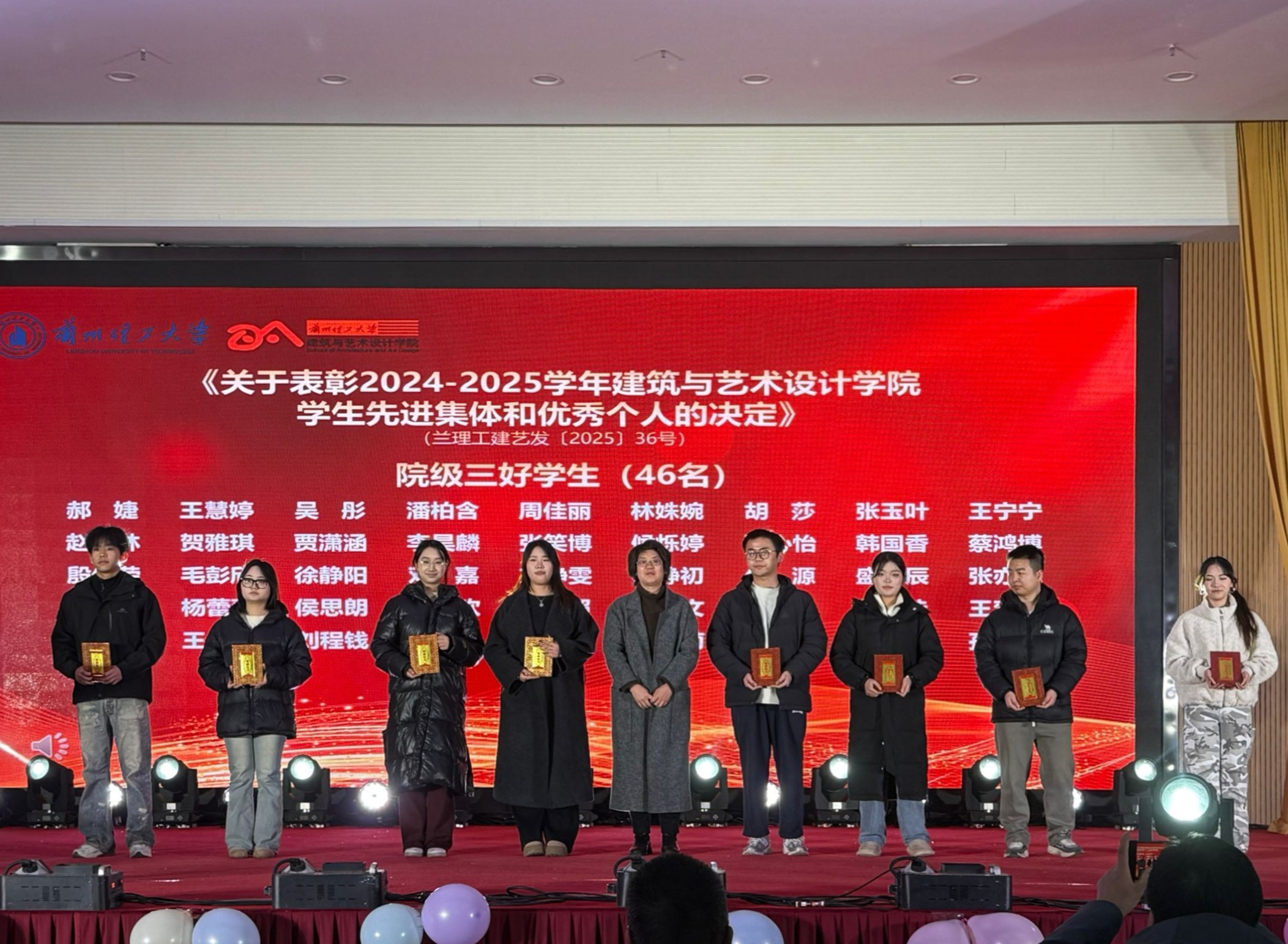 为表彰先进、树立榜样,营造勤学笃行、奋发向上的优良学风。12月26日晚,建筑与艺术设计学院2024-2025年度学风建设表彰大会暨迎新晚会在兰工坪校区大学生活动中心举行。学院领导班子、各系主任、辅导员、班主任代表及学生代表齐聚一堂,回顾年度奋进历程,表彰先进模范典型,共赏文艺盛宴。