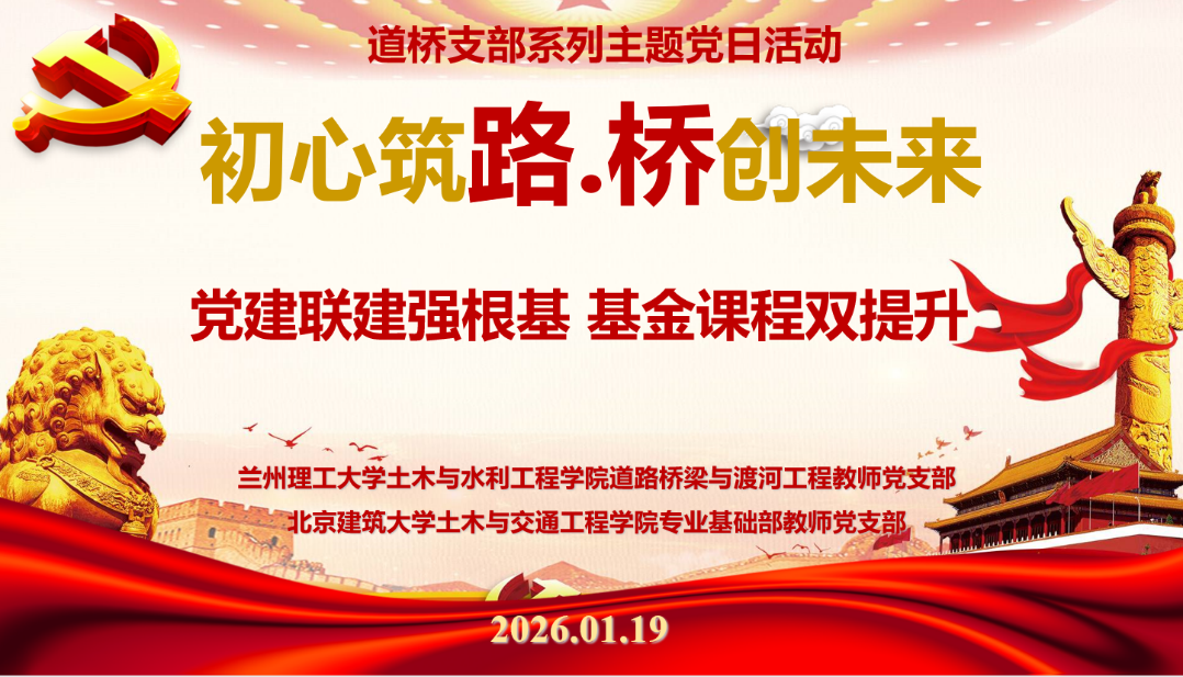 1月19日,土木与水利工程学院道路桥梁与渡河工程教师党支部与北京建筑大学土木与交通工程学院专业基础部教师党支部、地下工程系教师党支部联合开展“初心筑路·桥创未来”系列主题党日活动。活动由道桥教师党支部书记李喜梅与北建大专业基础部教师党支部副书记张鹏冲共同主持。