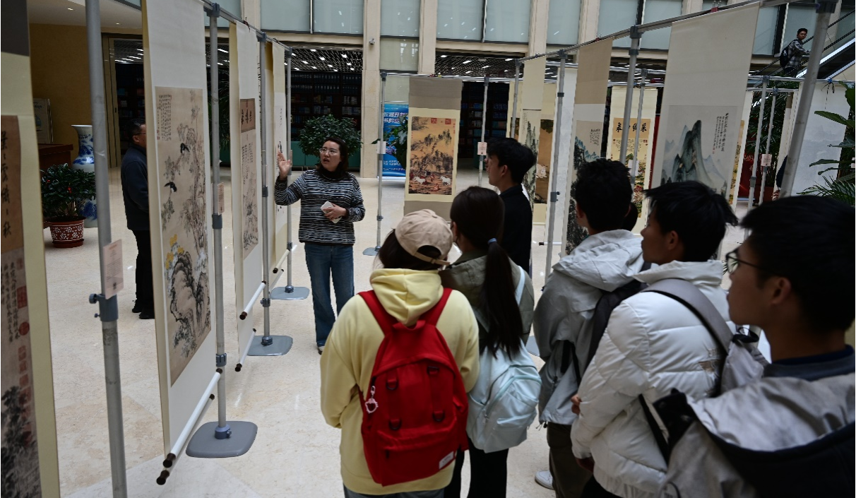 本次展览以金石拓片为载体,精心遴选知名博物馆珍藏的52幅中国历代馆藏书画作品,同时展出22幅具有代表性的非遗金石拓片佳作,作品题材丰富多元,涵盖山水、人物等多种门类,笔墨间尽显中华传统文化的独特魅力与艺术精髓。为帮助师生更好地领略作品内涵,展览期间,图书馆不定期邀请建筑艺术设计学院专业教师现场讲解,结合作品背景、拓片技艺与书画美学进行细致解读,让师生在近距离观赏中,深入感受金石拓片的工艺之妙与历代书画的文化底蕴。