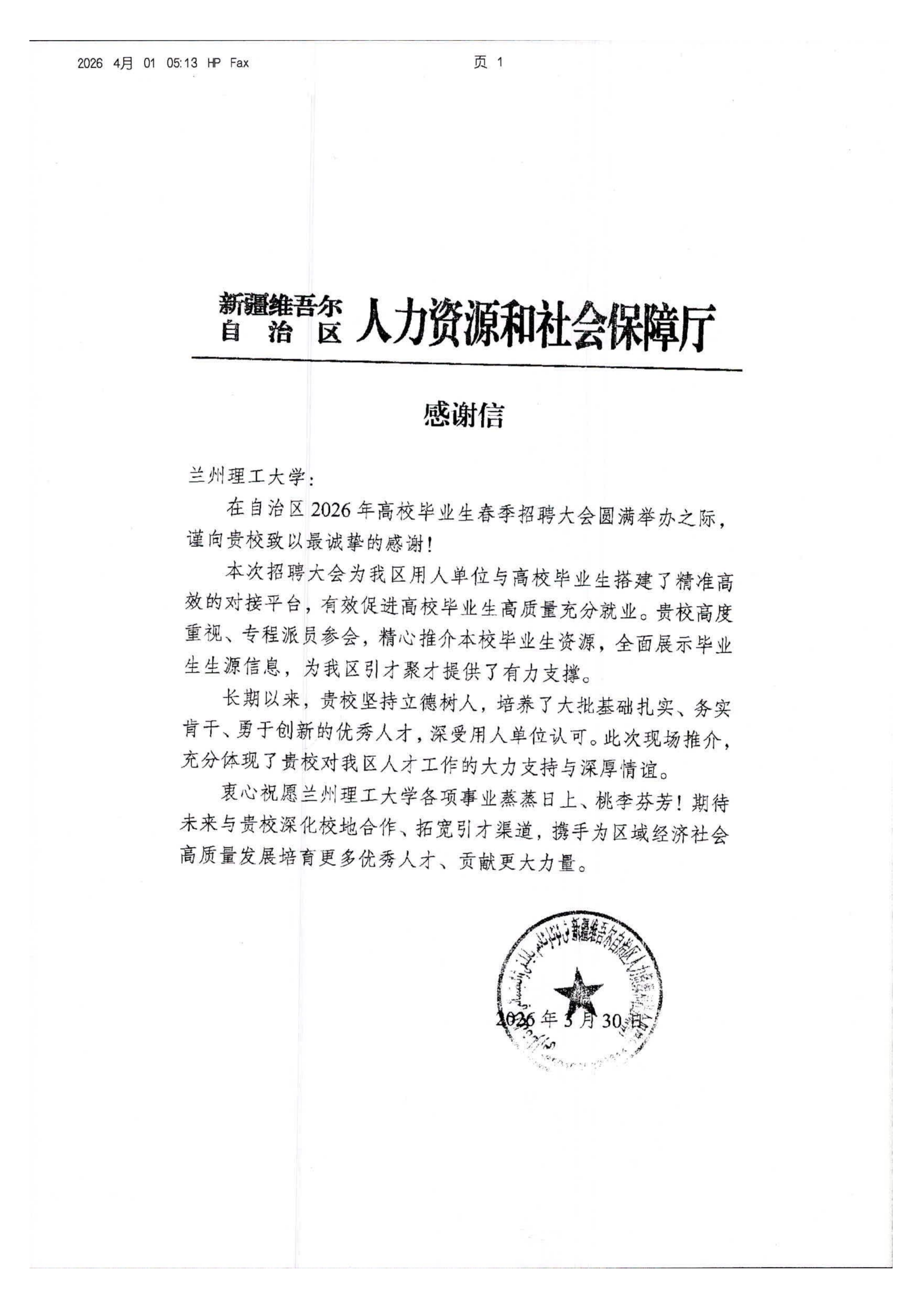 近日,新疆维吾尔自治区人力资源和社会保障厅专门向我校发来感谢信,对我校学生就业创业服务中心在新疆维吾尔自治区2026年高校毕业生春季招聘大会中的积极参与和对毕业生高度负责的态度表示诚挚感谢与肯定。