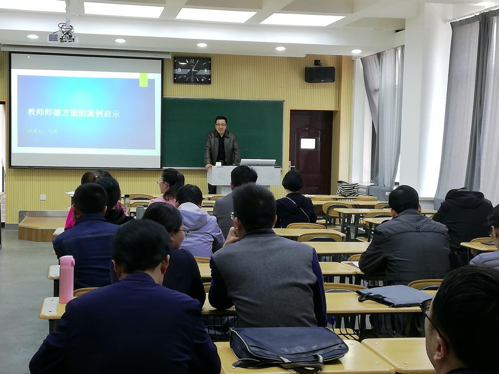 马霖针围绕教师师德方面进行主题报告。他表示,教师是人类灵魂的塑造者,是学生的领路人,所以教师责任重大,使命光荣。作为高校教师要严于修身,严格执行《新时代高校教师职业行为十项准则》,通过列举高校教师师德方面的案例,启示老师们要自觉筑牢思想防线,千万不能触碰师德禁行行为的红线。