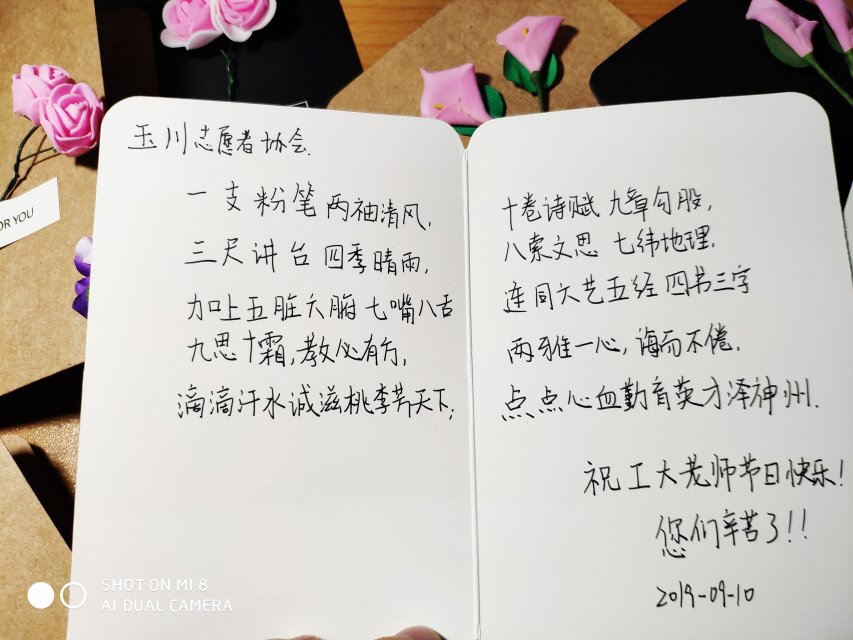 当天早上,玉川志愿者在彭家坪校区红柳广场北侧和南村食堂门口设置了值班点,提前进行了宣传和感恩师生的祝福征集活动,让参与者写下感谢师恩的小寄语。寄语由志愿者抄到送给老师的贺卡上,并将贺卡分批送给在校老师。此次教师节志愿活动为期两天,旨在通过真诚的祝福和点滴的心意表达学生对教师节的重视,对老师的尊重和感谢。