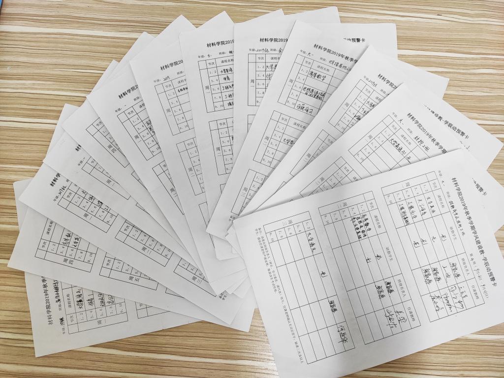 在19级新生开始大学第一课之际,材料学院学风建设教-学联动预警卡制度也紧跟落实。材料学院学风建设教-学联动预警卡建立了班干部→任课老师→班主任、辅导员这样一套严谨、具有层次性的管理预警机制,确保任课老师、班主任、辅导员及时掌握班级学风学情,对于无故旷课三次及以上的学生,建议任课老师取消该生考试资格。教-学联动预警卡制度充分提高了新生对大学课堂的重视程度,督促同学们做好上课准备、集中上课时的注意力,确保教学活动有序进行。