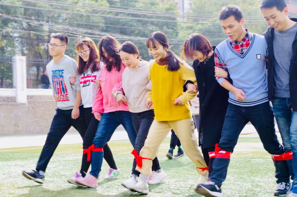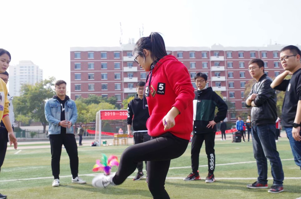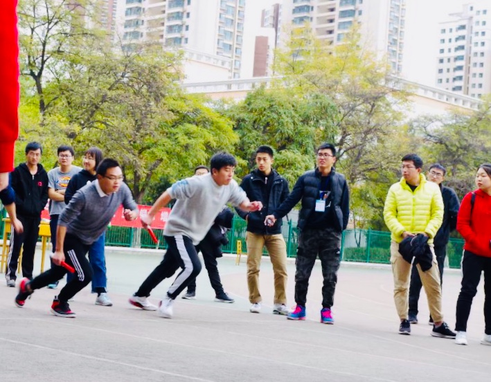 活动共设置八人九足、跳大绳、踢毽子、足式保龄、飞夺泸定桥、端乒乓球接力趣味运动6项,男女混合4×100米接力田径比赛。趣味运动比赛过程中,导师都根据自己的体能实际参与到活动中来,有的为同学当好拉拉队员,有的为活动抡大绳,尤其是100米接力,我们各位同学,不仅积极组队,而且身体力行当好主力。
