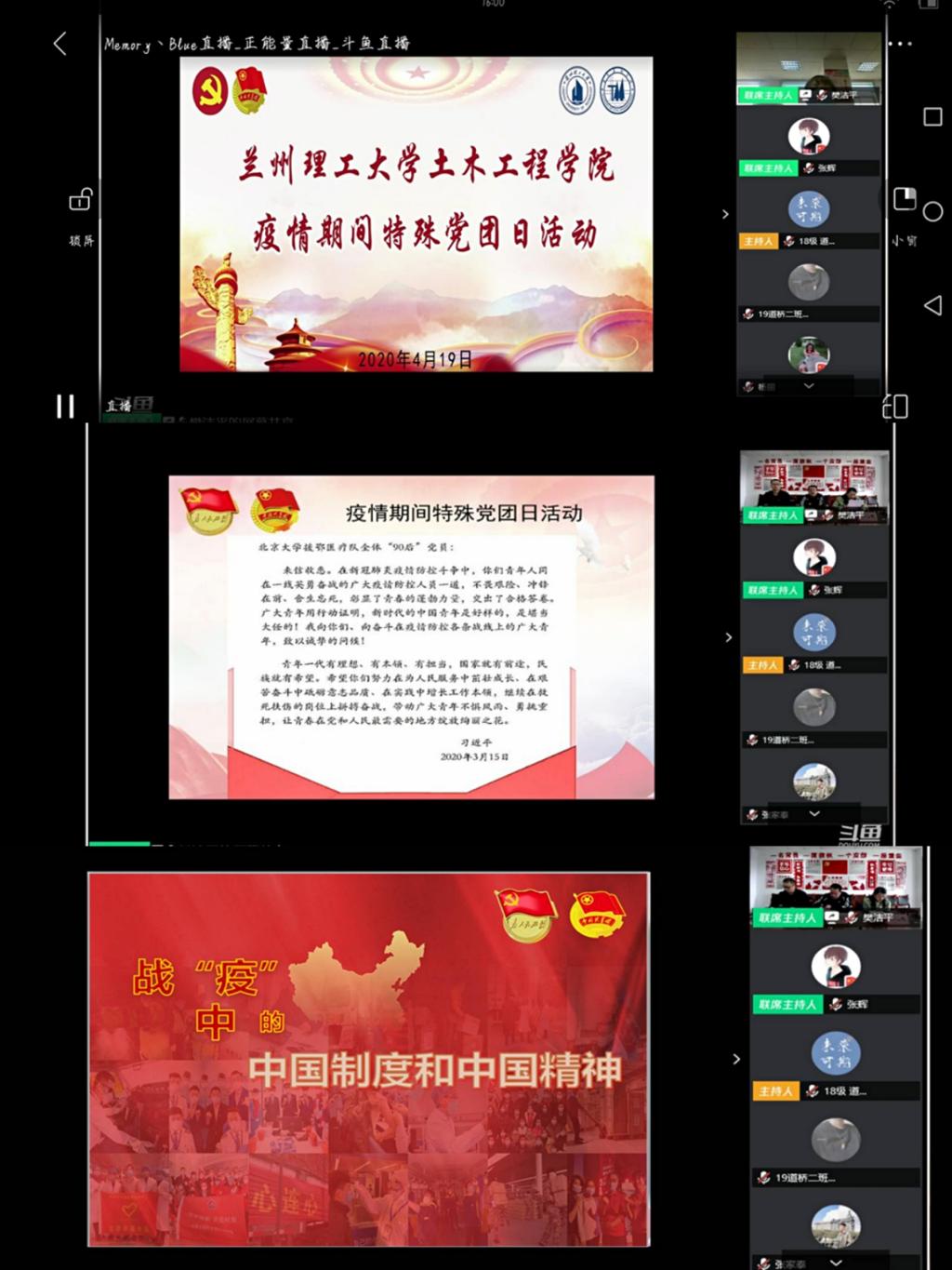 4月19日下午,土木工程学院开展了疫情期间“线上”主题党日团日活动,学院党委书记田治学及全体辅导员参加了活动,学院师生共计3000余人观看了活动直播。