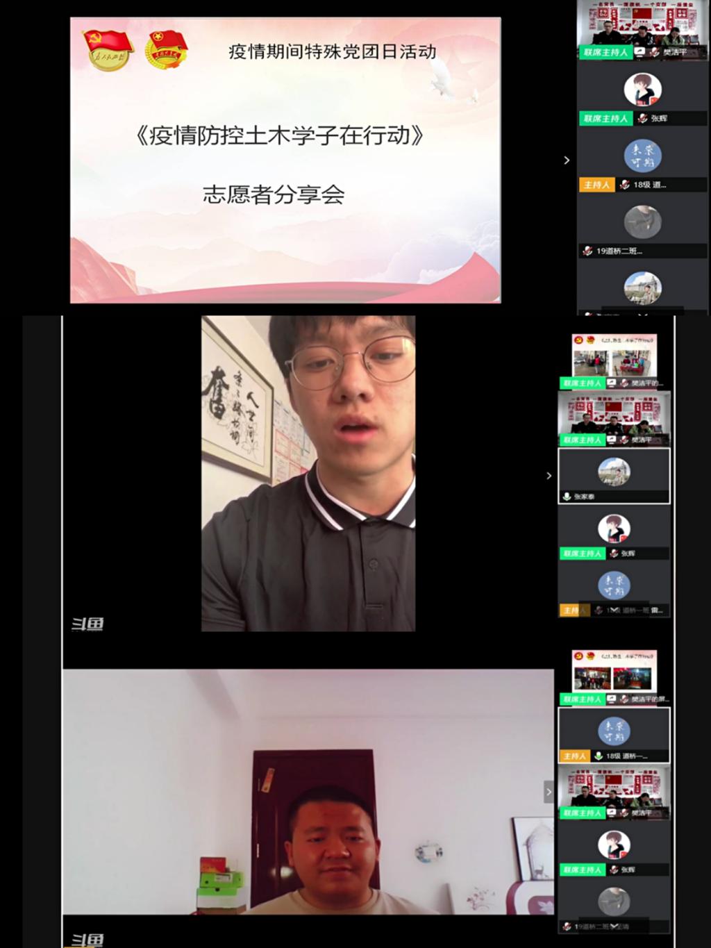 疫情期间,土木学院党员、团员青年积极参与疫情防控各项工作,在《疫情防控土木学子在行动》志愿者分享会上,学院疫情防控志愿者代表杨丽、马茂源、张家泰、雷峻懿、李至清5名同学先后做了交流发言。