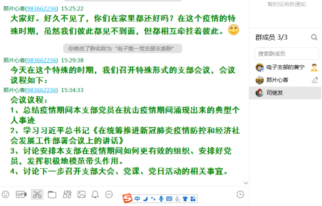 3月15日,电子本科生第1党支部采取在支部qq群内互动交流的方式,召开网上支部委员会会议。本次会议更好的引领全体支部党员统一思想认识,凝聚思想共识,践行初心使命,发挥“我是党员我上前”的主人翁精神。