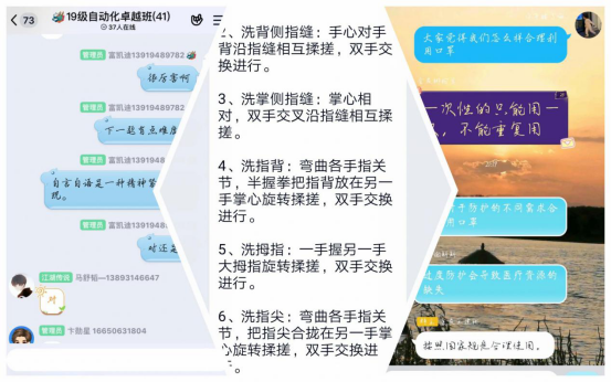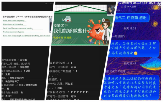 在疫情防控期间,电信学院学工战线针对疫情防控期间特殊情况,拓展思政工作思路、创新思政工作思路,合理运用好疫情防控思政“教材”,确保学生假期学习与成长规划全面跟进不断线、学生抗疫思想引领与心理疏导全程导航“不掉线”。 将疫情变成加强学生爱国主义教育、社会责任教育、生命教育、感恩教育的“教材”,引导学生在疫情中学习、思考、成长,共同上好“战疫”这堂育人大课。