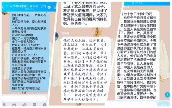 学院深入学习习近平总书记关于疫情防控工作的重要讲话精神,贯彻落实学校疫情防控与2020春季学期工作会议精神,充分利用疫情防控当中的鲜活案例,学院主动抓住契机,发挥思想政治教育立德树人功效,守好“主阵地”,上好这堂思政大课,深入开展中国特色社会主义核心价值观教育、爱国主义主义教育,在疫情防控的实践中帮助学生坚定中国特色社会主义道路自信、理论自信、制度自信、文化自信,引导同学们树立正确的世界观、人生观、价值观。2020年1月以来,电信学院党委牵头组织各党支部结合实际,积极开展主题党日活动,创新“三会一课”载体,履行“三会一课”制度,确保制度落实不放松、思想学习不掉线、抗“疫”行动不放假,充分发挥党支部战斗堡垒作用。各党支部广泛开展“阻击疫情,党员先行”系列党日活动,引导学生党员、党员发展对象、入党积极分子主动亮明身份,深刻认识做好疫情防控工作的重要性和紧迫性,按照坚定信心、同舟共济、科学防治、精准施策的要求,在坚决打赢疫情防控战中践行初心使命,体现责任担当。