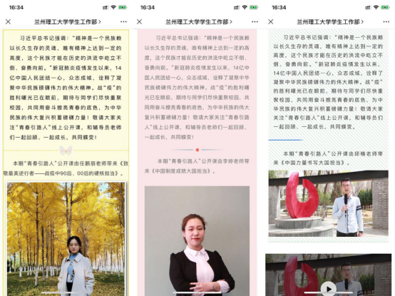 学院辅导员李婷、任鹏丽、邱楠积极参与学校“青春引路人”线上公开课,号召全校学生一起回顾、一起成长。《中国力量书写大国担当》讲述了面对疫情,共产党员的冲锋陷阵、医护人员的奋勇向前、普通民众的大力支持、企业家的无私奉献;《致敬最美逆行者——战疫中90后、00后的硬核担当》诠释了一代人有一代人的长征、一代人有一代人的担当;《中国制度成就大国担当》彰显了抗疫奇迹背后的中国制度优势,是中国制度成就了疫情之下的大国担当。此外,学院组织全体本科生和研究生在家通过电脑和手机客户端等方式收看“全国大学生同上一堂疫情防控思政大课”、“千万学生同上一堂国家安全教育课”课程直播,全面加强大学生思政教育。