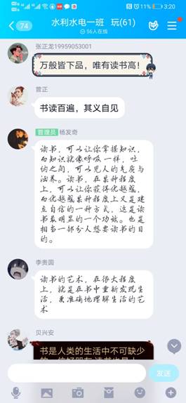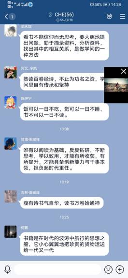 活动中讲述了世界读书日的由来及节日存在的意义,了解了书籍在人类社会发展中的重要意义及自身演化过程,特别是共产党领导中国社会革命的艰难岁月中,书籍的珍贵和知识带来的力量。同时大家发言交流个人读书体会,并向大家推荐自己认为有阅读价值的国学经典书籍。同学们表示,他们将珍惜来之不易的学习环境,认真学习科技文化知识,在新时代传承中华优秀传统文化,并坚信书籍伴随成长,必定“腹有诗书气自华”。