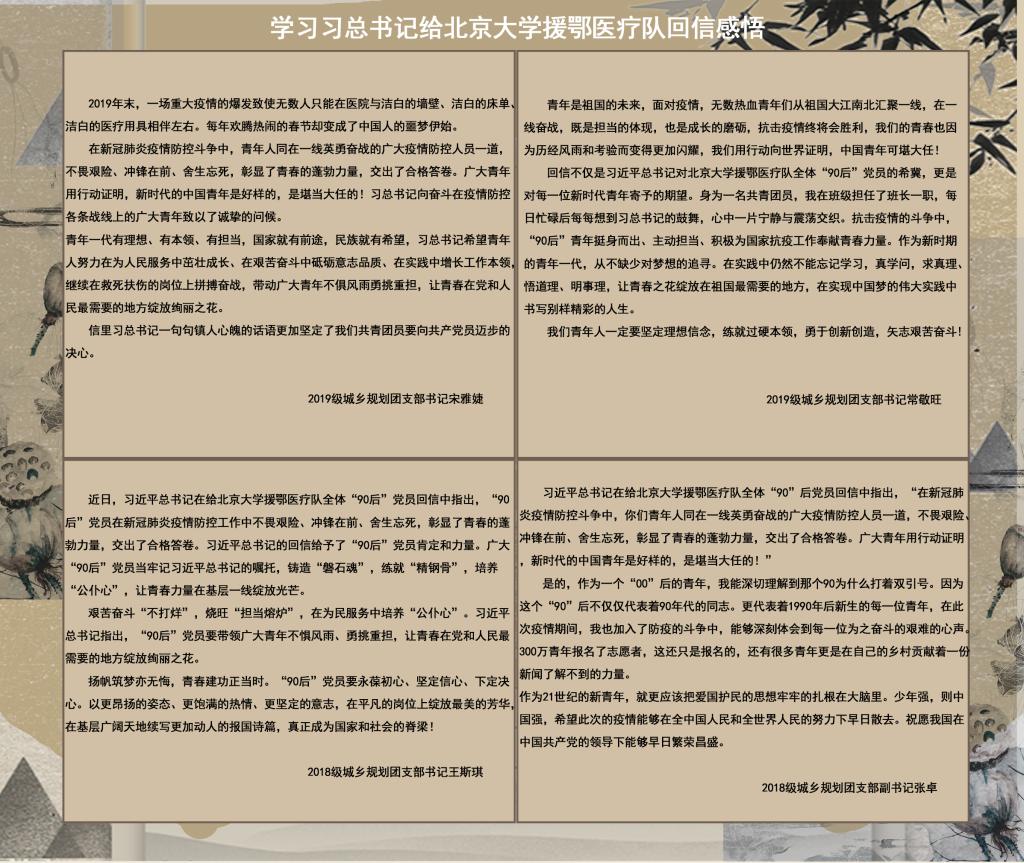 3月11日,北京大学援鄂医疗队北医三院王奔和吴超两位“90后”临时党支部书记,代表北京大学三家附属医院援鄂医疗队的34名“90后”党员给习近平总书记写了一封信,表达了“90后”不怕吃苦、不怕牺牲的坚定决心。3月15日,习近平总书记给北京大学援鄂医疗队全体“90后”党员回信,向他们和奋斗在疫情防控各条战线上的广大青年致以诚挚的问候,并寄语广大青年不惧风雨、勇挑重担,“让青春在党和人民最需要的地方绽放绚丽之花。”