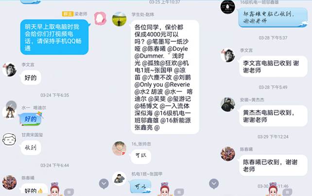 疫情期间,学院党委副书记,辅导员与学生连线不断,了解到学生毕业设计没有电脑,考研复试需要资料、求职择业需要成绩单和证书等材料的困难。辅导员迅速摸排,并让学生填写《邮寄资料汇总表》,注明电脑、书籍及存放的位置和收件地址等信息。在宿舍楼长的协助下,赵炜副书记与辅导员一起到学生宿舍,与每一个学生视频连线,挨个宿舍找电脑、找证书、找书籍等材料,通过邮政快递邮寄到学生家中,邮费由学院统一支付。
