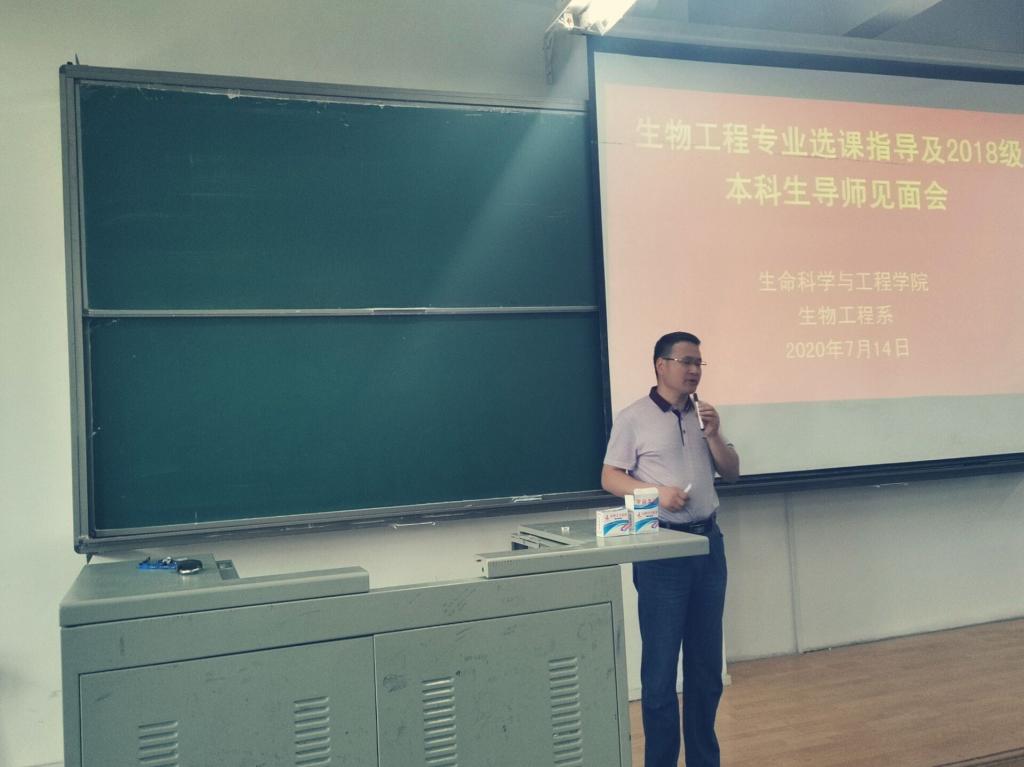 7月14日下午,生物工程系在彭家坪校区西教1-105教室召开低年级学生选课指导及2018级本科生导师见面会。会议由生物工程系主任伍国强教授主持,李雪雁教授、巩慧玲副教授、袁惠君副教授、冷非凡副教授、鲍婧婷博士、唐丹博士、魏明博士、程子义博士等老师以及2018级、2019级生物工程专业学生共计120余人参加会议。