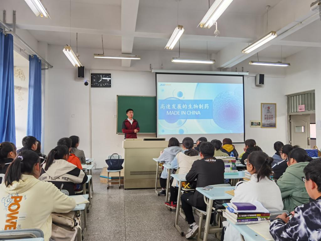 课堂伊始,唐丹老师向同学们简要介绍了甘肃健顺生物科技公司,同时希望同学们抓住此次走近生物企业的机会。大家对健顺生物团队走进我们的课堂表示了热烈欢迎。第一节课耿风廷老师作了题为“高速发展的生物制药-MADE IN CHINA”的讲座,主要介绍了生物药物的种类、发展历程,科普了疫苗种类及作用方式等,让大家认识到疫苗对人类健康的重要性。最后,耿老师勉励大家要热爱生物工程专业,力争学有所成,为中国生物制药的蓬勃发展奉献自己的力量。