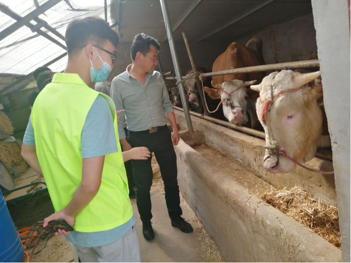 实践队跟随村委来到了养羊合作社和养牛合作社,深入了解合作社的基本情况。据村委书记的介绍,当地羊的品种优良,均为东乡贡羊。牛为东乡品种牛,有丰厚的利润。除了养牛羊外,当地还有养鸡合作社,鸡场实现了养殖机械化管理,形成了一条完整的产业链。饲料用优质的玉米加工而成,通过传送道进入鸡舍里,鸡粪也是通过同样的方式运送到当地的加工厂加工成肥料。村民通过分红的方式获得利润,收入可观。