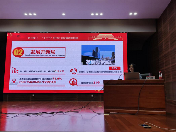 马云霞副教授以“开启全面建设社会主义现代化国家新征程--学习第十九届中央委员会第五次全体会议公报”为主题,分享了《中共中央关于制定国民经济和社会发展第十四个五年规划和二〇三五年远景目标的建议》。她将“十三五”社会经济发展取得成就做出详细介绍,并结合就业发展方向,带领大家了解国家发展战略方向。鼓励广大青年将个人理想追求融入党和国家事业之中,以青春之我,创造青春之中国、青春之民族。现场气氛热烈,掌声不断。