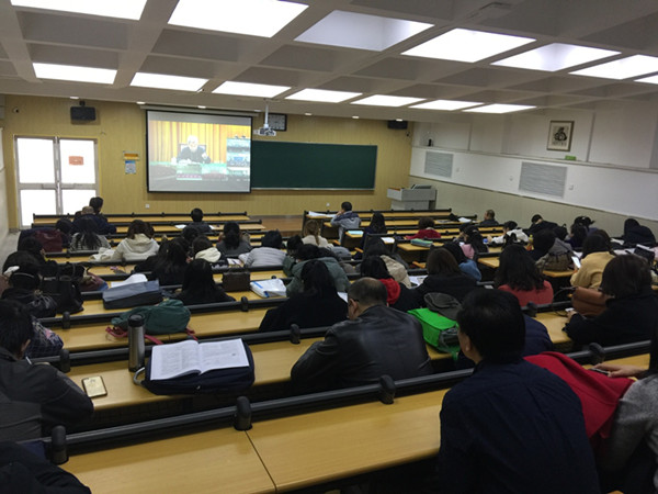 11月17下午学院党委召集全院教职工在兰工坪校区崇理楼教室,集体学习中央宣讲团成员、教育部党组书记、部长陈宝生在学习贯彻党的十九届五中全会精神宣讲报告会上的讲话视频。