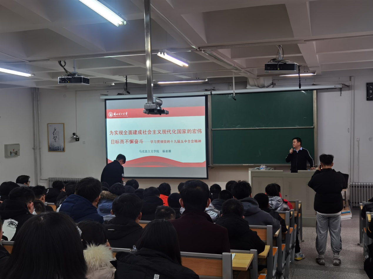 2020年12月1日下午,兰州理工大学能源与动力工程学院“青马工程”培训活动于彭家坪校区集贤楼208教室如期举行,本次培训活动以“为实现全面建成社会主义现代化国家的宏伟目标而不懈奋斗——学习贯彻党的十九届五中全会精神”为主题,邀请马克思主义学院杨亚雄副教授主讲,能动学院青马工程培训班248人参与学习。