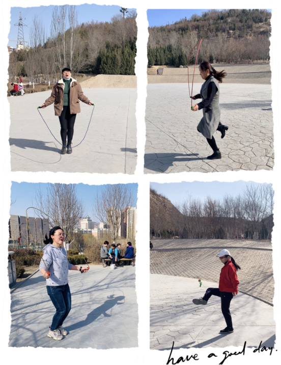 5人一组互相配合、共同完成的齐心协力跳大绳