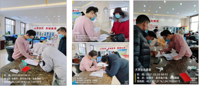 2021年2月3日,这一天潘国栋同学主要负责对返乡人员进行信息报备。每一位来到大厅报备的住户需要进行个人信息填写,潘国栋同学将他们有效的核酸报告复印留档,并签署承诺书,主动填写返松前近14天的行程信息,并收集他们的行程码以及外省专用健康码,打印留档。最后告知每一位报备的住户所在小区网格员的微信,备注好做不时之需,时刻了解社区疫情防控情况。