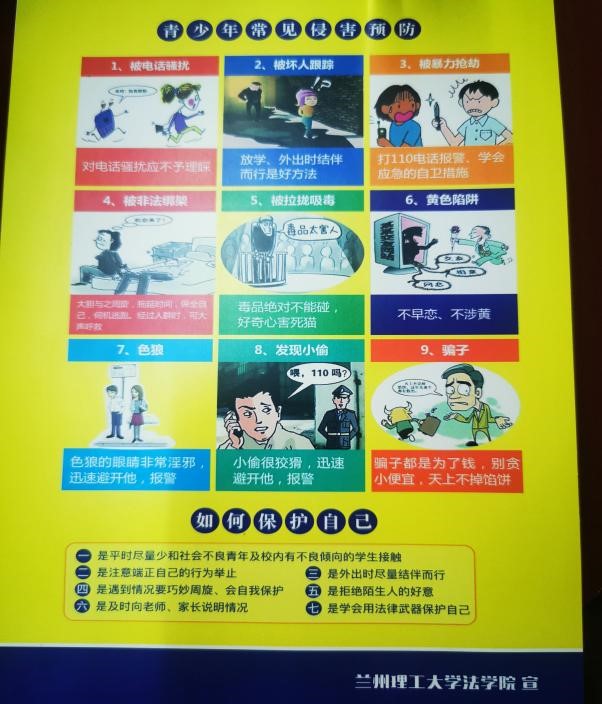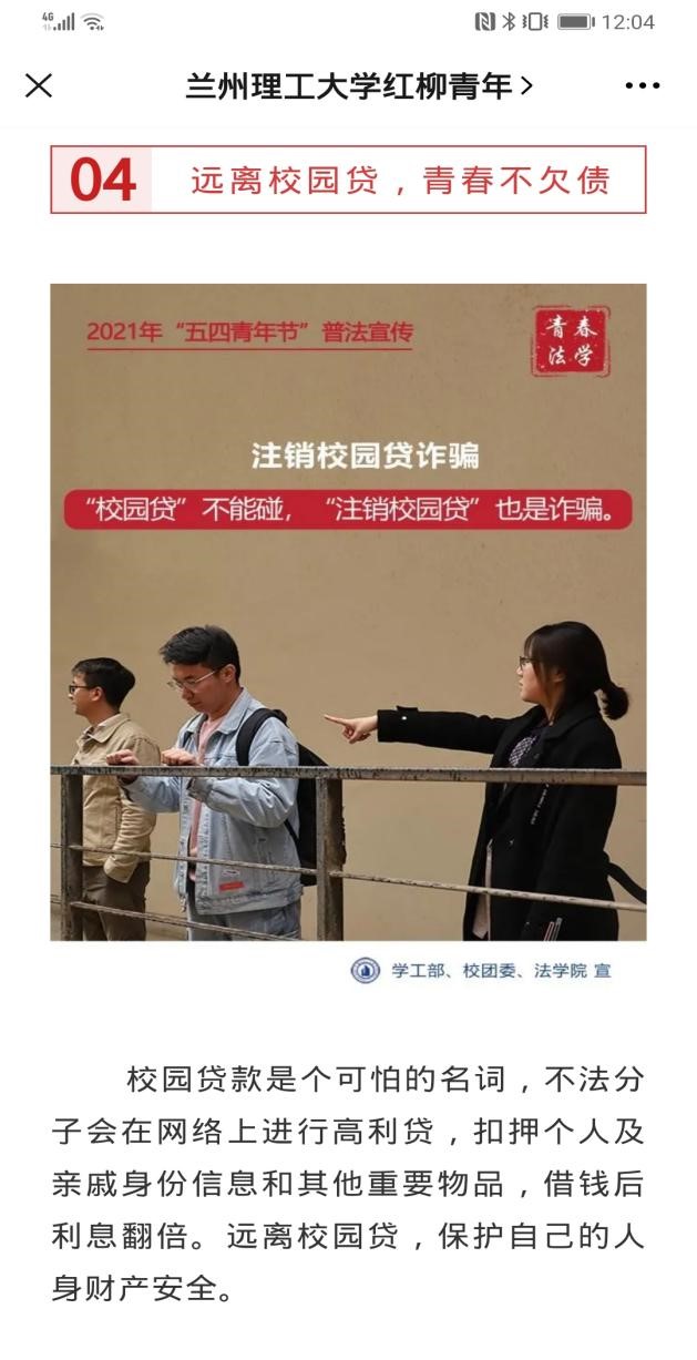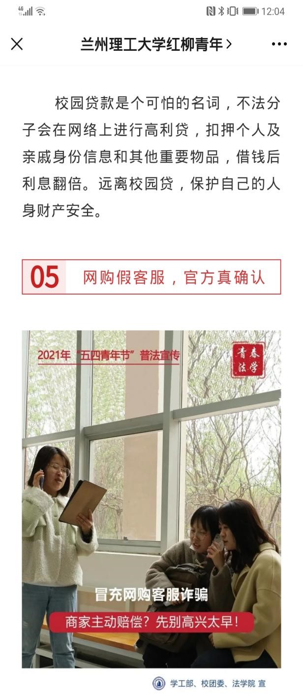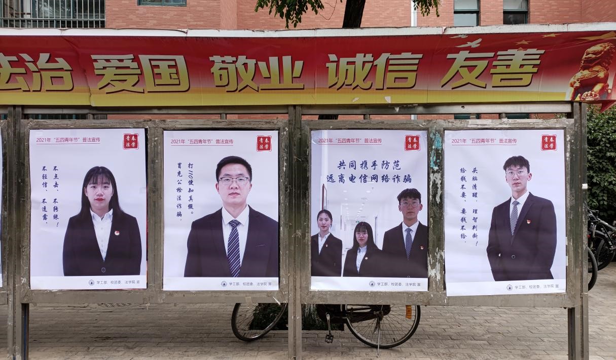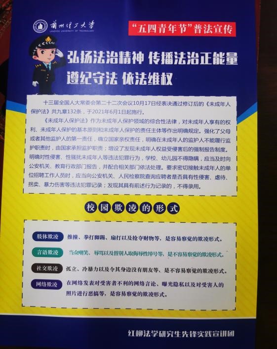 2021年5月4日是第72个“五四青年节”。法学院青年认真学习贯彻习近平总书记重要讲话清华大学考察重要讲话精神,弘扬和传承“五四精神”,积极参加学院策划组织的“五四青年节”系列普法宣传活动,通过宣传宪法、国家安全、民法典、未成年人保护法等相关法律法规,传播法治正能量,提高宪法在广大青少年中的普及性,以实际行动在生动实践中展现红柳法学青年奋斗新征程的决心与信心。根据习近平总书记对打击治理电信网络诈骗犯罪作出的重要指示要求,做文明校园安全稳定守护者。策划普法宣传“反诈有法”主题,高度概括如何预防的十个主题海报两校区校园、兰州理工大学红柳青年官微进行宣传,为同学们敲响防在日常警钟。积极配合共建单位七里河公安分局反电诈大队深入开展打击治理电信网络新型违法犯罪专项活动,切实提高社会公众的防范意识和识别能力。根据校团委安排,五月中旬起深入各学院各团支部进行《宪法》《国家安全法》宣讲宣传。结合新修订的今年6月1日起正式施行的《未成年人保护法》设计制作青少年法制专题宣传彩页,研究生志愿者通过主题沙龙、专题宣传深入中小学青少年、家长中宣传法律知识,悉心讲解包括监护人监护不力、学生欺凌、性侵害未成年人、未成年人沉迷网络等问题,大力宣传这部“六位一体”的未成年人保护综合性法律。拍摄“以案说法”微视频,剧本结合最新电信网络诈骗手法及防范措施,6个反诈骗、拒绝校园贷的主题宣传短视频将于5月中旬进行展播,助力校园安定和谐,提升学生防诈反诈意识和能力。