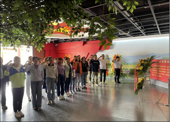 在纪念馆正厅,全体党员干部向毛泽东等革命先辈的雕像敬献花篮,同志们整齐肃立、鞠躬致敬,面向党旗重温入党誓词,深切表达他们坚定共产主义理想信念、践行共产党人初心使命的激越心声。
