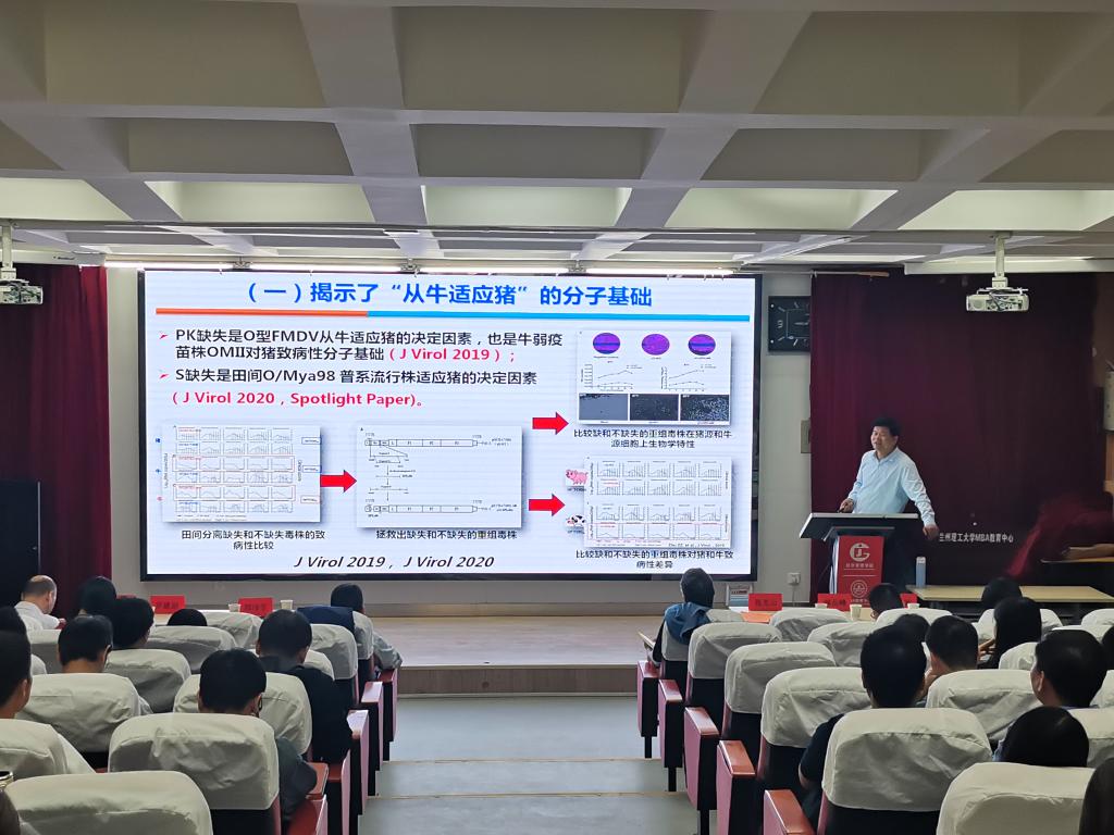 座谈会结束后,郑海学所长在兰工坪校区1北204报告厅作了题为《口蹄疫高效疫苗的设计和创制》的学术报告,报告会由伍国强主持。报告会上,郑海学向师生们介绍了国内外重大动物疫病及相关疫苗的研究进展,从畜禽疫病危害的严重性出发,讲解了从免疫学、医学等角度解决这一问题的研究过程,提出须重视畜禽疫病带来的危害,重点向师生分享了其相关疫苗的设计与创制成果。随后,储岳峰对兰州兽医研究所科研环境、硕博招生情况及优惠政策进行了宣讲,并欢迎广大学子进入兰州兽研所深造学习。