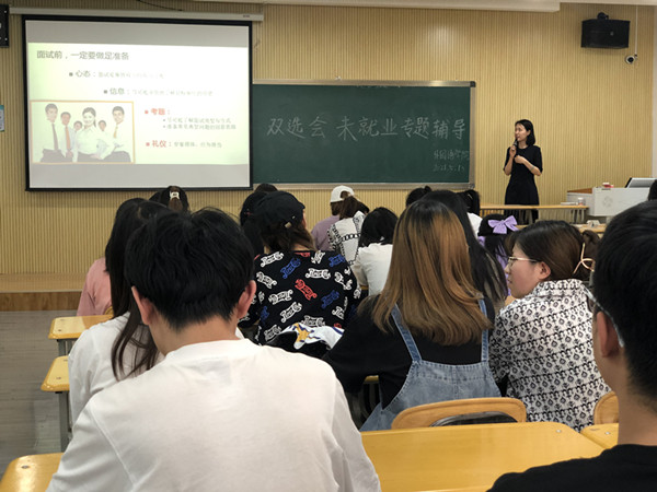 焦娜分析了就业形势并通报了各班就业率,指出在当前严峻的就业环境下,未就业毕业生应根据自身的特点,积极转变就业观念,认清就业形势,培养自我意识,把握好双选会就业机会,遇到挫折时要正确面对,调整好心态,积极就业,以最佳的状态去迎接崭新的明天,成就自己美好灿烂的未来。