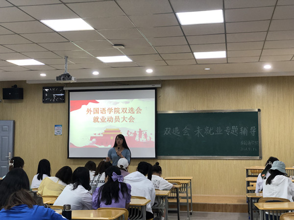 为做好2021届毕业生就业指导服务,帮助学生认清就业形势,鼓励动员学院未就业学生为参加“2021年大中城市联合招聘高校毕业生春季专场甘肃站暨兰州理工大学2021年毕业生春季双选会”做好准备,5月13日下午,外国语学院在毓英楼208教室举办双选会求职前针对性动员指导大会。此次会议邀请了学校就业指导与服务中心马文静老师和文学院杨玉洁同学做报告,学院党委副书记焦娜及本科就业辅导员杨朵儿出席会议,2107级未就业毕业生参会。