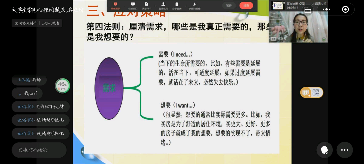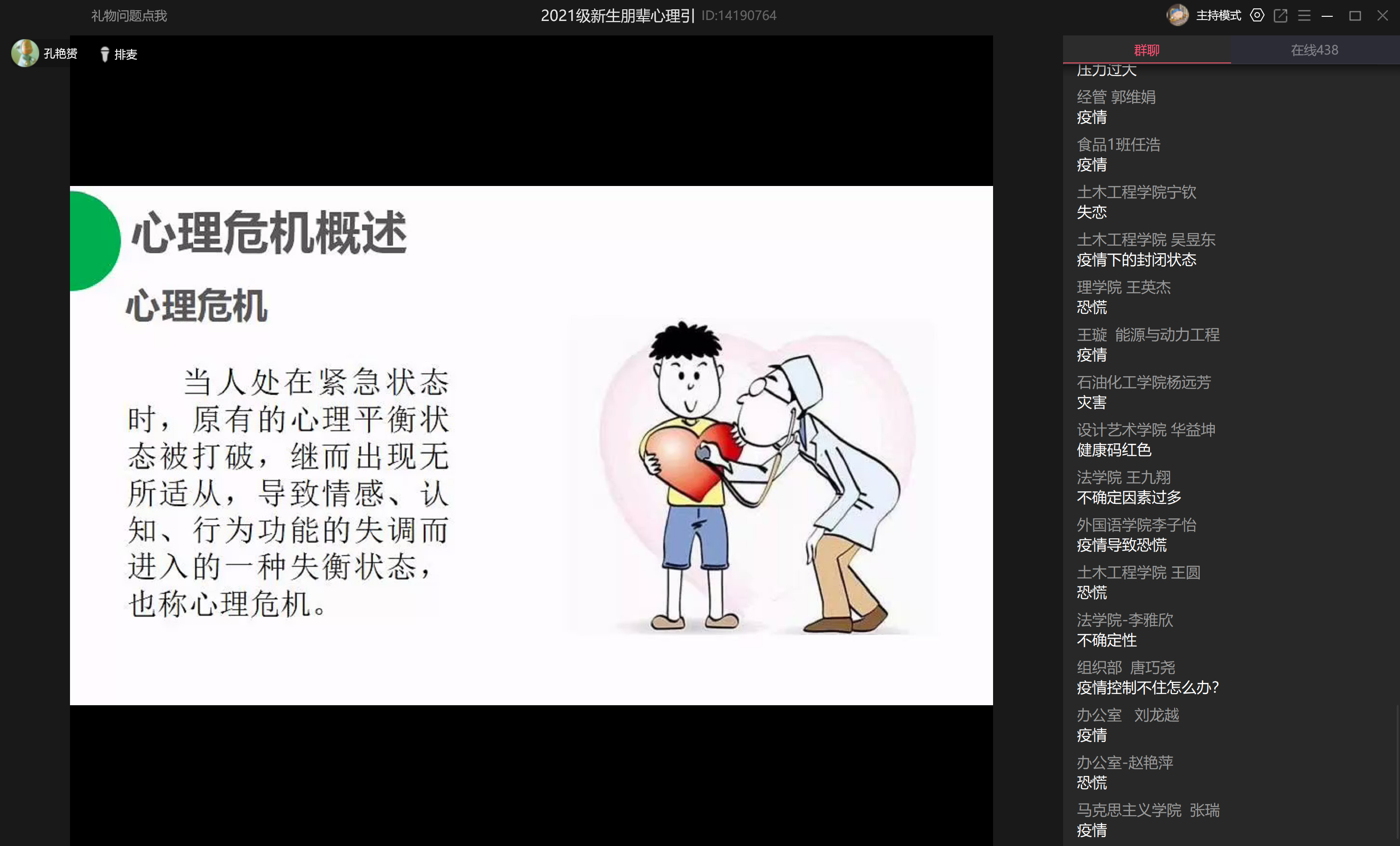 培训由西北民族大学心理健康中心金荷香、我校心理健康指导服务中心孔艳赟、崔孝艳三位老师主讲。老师们结合丰富的工作经历以及相关心理咨询的案例,分别围绕《朋辈心理引导员的工作职责、内容和方法》《大学生心理危机干预》《大学生常见心理问题及应对措施》三个主题进行了专题培训。培训过程中,老师们根据目前的疫情防控形势,强调朋辈心理引导员在维护学生疫情期间的心理健康工作中具有重要作用,应该利用所学知识和技能,履行好作为“观察员”“宣传员”“联络员”“支持者”的职责,学会观察并及时报告同学中存在的一些非常态心理现象,力所能及地帮助同学们更好地应对疫情带来的心理应激反应,协助老师更好地开展心理危机预防与干预工作。培训过程中,同学们认真聆听老师的授课,通过线上课堂连麦、发消息等方式提出疑惑、积极参与问题讨论,老师们做了耐心细致的解答。