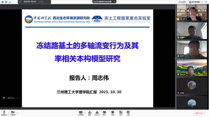 中国科学院西北生态环境资源研究院、冻土工程国家重点实验室周志伟副研究员做了题为《冻结路基的多轴流变行为及其率相关本构模型研究》的学术报告。报告人考虑了冻土显著的流变属性,根据不同热、力路径的流变试验,研究了冻土的蠕变特征和长期强度演化特征,进而拟定相关参数,从热力学理论出发构建了普适性较强的冻土率相关本构模型。