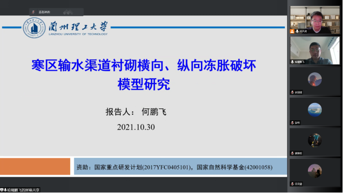 兰州理工大学青年教师何鹏飞以高寒区输水渠道为工程背景,做了题为《寒区输水渠道衬砌横向、纵向冻胀破坏模型研究》的学术报告。报告人介绍了寒区输水渠道面临的冻害问题和冻害特征,在考虑冻土和衬砌的相互作用的情形下,建立了衬砌板在横向和纵向方向的力学分析模型,对工程实例进行了分析计算,为设计施工提供了理论支撑。