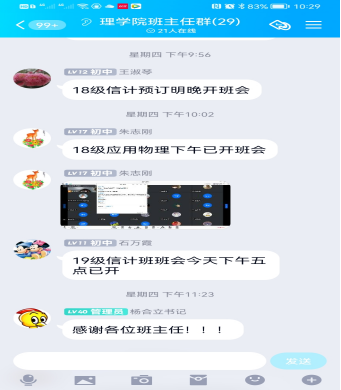 班主任老师主要结合疫情形势,要求班级学生严格按照学校疫情防控精神,做到校园戴口罩、不聚集、不扎堆、不串宿舍、勤通风、勤洗手,及时关注学生的健康问题,强化网络安全,防止电信诈骗,营造良好的生活环境以及学习环境,上好每一堂线上课程,各班委认真履行职责,促进党班团一体化建设,争做优秀班集体。毕业生班级班主任老师强调学生做好线上招聘,鼓励学生就业不断线,积极就业争做新时代好青年。同时各班主任老师征集学生在学习和生活上的困难,答疑解惑。