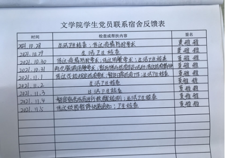 为实现党员联系人防疫工作的落实,文学院还要求党员联系人做好工作记录,对党员联系人的工作进行抽查,并由宿舍长以填写反馈表的形式来监督党员联系人工作的进行,以确保学校指示的每一项疫情防控要求都落到实处。