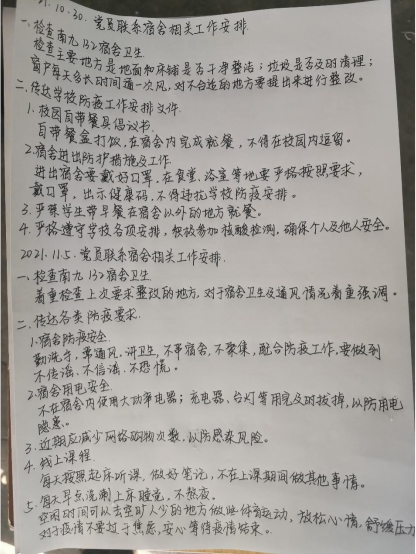 各“党员联系人”先从日常抓起,每日定时联系各宿舍。询问同学们生活方面的困难并进行及时的帮助。同时,以拍照的形式在线上检查学生宿舍卫生情况以及学习情况,督促同学们严格管理自己,共同营造一个良好的学习生活环境。同时,特别要求各为联系人多关心关爱隔离留观同学,每天定时联系,鼓励留观同学坚定信心、抗击疫情。