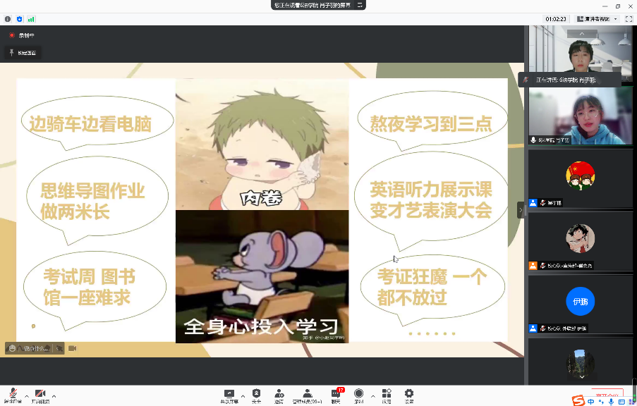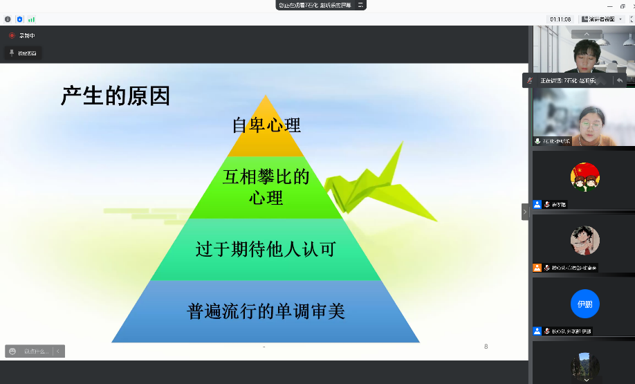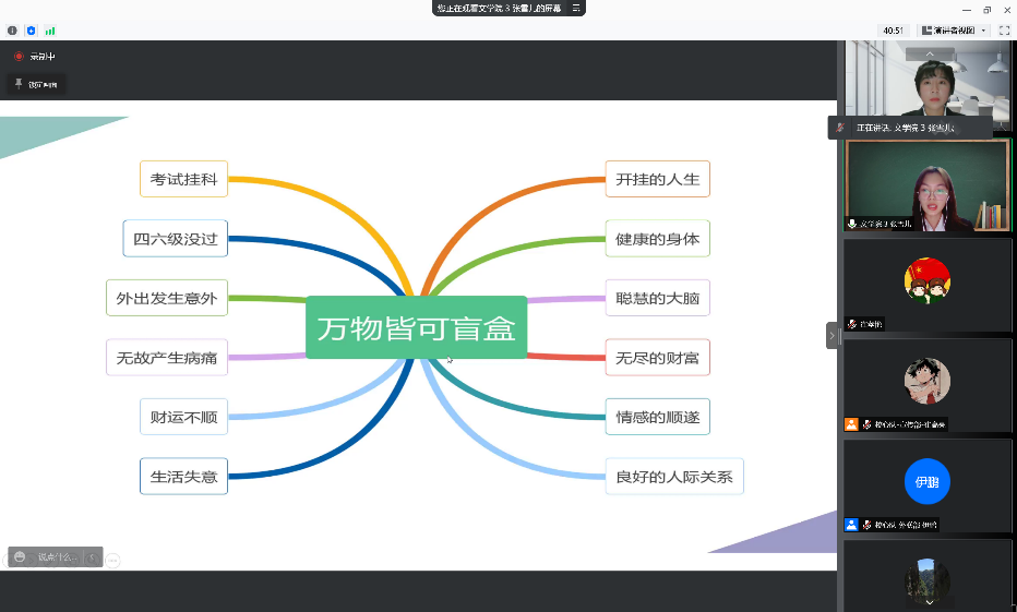 晋级团队精心准备,围绕相关主题,设计灵活多样的活动,结合实际案例、数据分析、问卷调查和短视频等方式,从心理学的角度分析这些与大学生密切相关的或者大学生普遍关注的社会热点现象,让同学们在参与的过程中学会解决相关心理问题。文学院以“万物皆可盲盒”为主题,通过现场抽盲盒让同学们体会猎奇心理;电信学院和土木学院的班会从大学生身边的实际案例入手引发大家的思考;理学院通过短视频对“社交恐惧”的具体表现进行举例;法学院通过问卷调查来统计分析大学生对“内卷”现象的看法及造成此现象的原因等。参赛选手们从不同的角度,运用不同的方法阐述了对这些现象的看法和建议,激发了同学们对心理健康知识的兴趣,懂得了如何处理心理问题,让自己更好的投入到学习和生活中。此次活动也丰富了同学们的疫情生活,帮助大家转移注意力,缓解疫情带来的紧张、焦虑、烦躁等心理,增强对生活的掌控感,平稳度过疫情期。