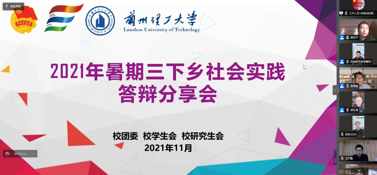11月5日,校团委举办了2021年暑期“三下乡”社会实践活动答辩分享会。团省委学校部副部长魏玮、甘肃省红十字协会宣传处副处长张雅文、省科协普及部二级主任科员王天鹏、校团委相关负责同志参加了会议,入围优秀答辩环节的36支实践团队依次进行了线上答辩,从实践内容、实践成果、实践感悟及社会影响等方面,进行了全面的总结和展示。