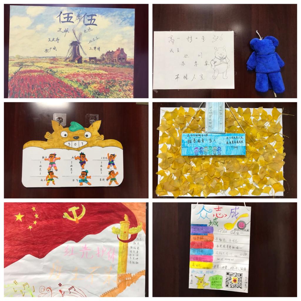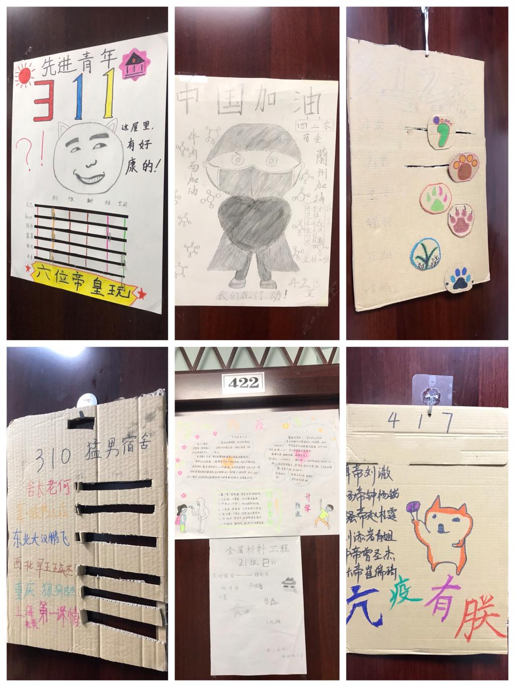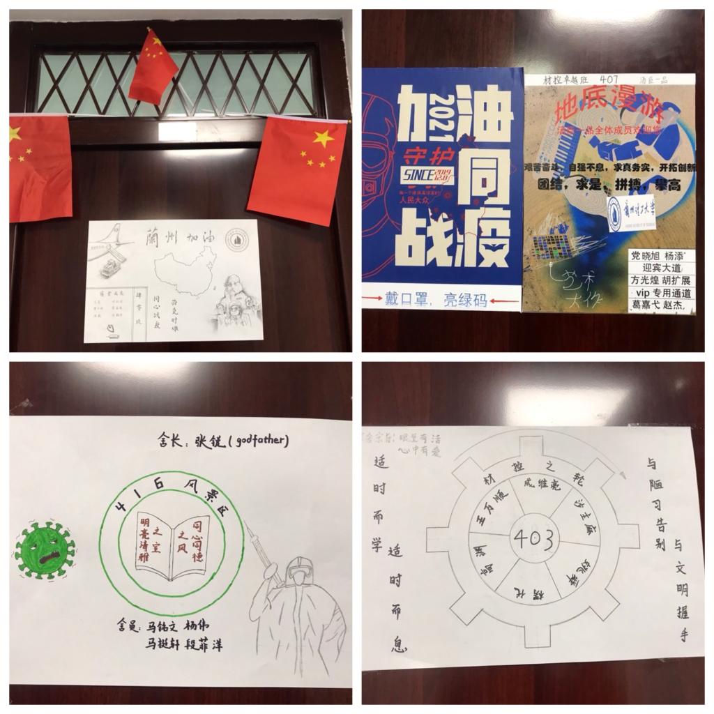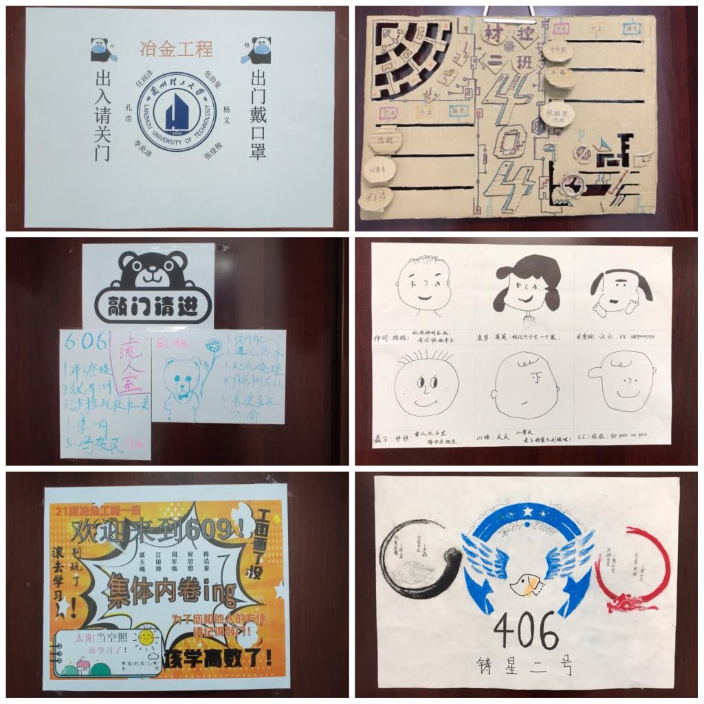 各班级以宿舍为单位,通过开展线上文艺展示主题班会、趣味短视频拍摄、寝室门标设计等趣味活动,让同学们在疫情期间排解心理压力,充实疫情期间课余生活,用健康平和的心态面对疫情遭遇期,让同学们自豪地告知担心的家长,“放心吧,学校的疫情防控工作做得很好,我们在寝室一点也不无聊!”每一张门标、贴纸,每一段寝室趣味视频、照片,每一个摆件、小绿植背后,都是一个个灵感的迸发,思想的碰撞以及材料学子对生活的热爱。有“汤臣一品”、“铸星二号”等对未来生活的期许,也有“葫芦兄弟”、“成仙预备会”等积极乐观的生活态度,更有“同心战‘疫’,共待花期”、“中国加油”、“蘭州加油”等对抗疫战士的感谢及对打赢此次疫情防控遭遇战的坚定信念,在同学们眼中,宿舍门牌不再是一串单调的代码数字,而是他们奇思妙想、脑洞大开创作的一方空间。